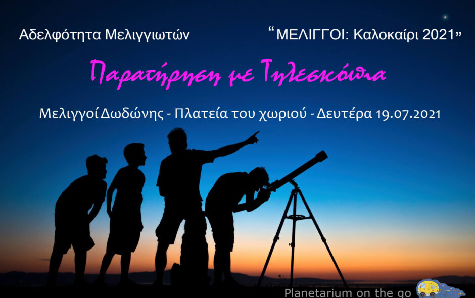 Η Αδελφότητα Απανταχού Ευρισκομένων Μελιγγιωτών διοργανώνει “Βραδιά Παρατήρησης Με Τηλεσκόπια”, τη Δευτέρα 19 Ιουλίου στην Πλατεία Μελιγγών, με τα τηλεσκόπια του Φορητού Ψηφιακού Πλανητάριου – Planetarium on the Go.Θα αναπτύξουμε ταυτόχρονα δύο τηλεσκόπια: