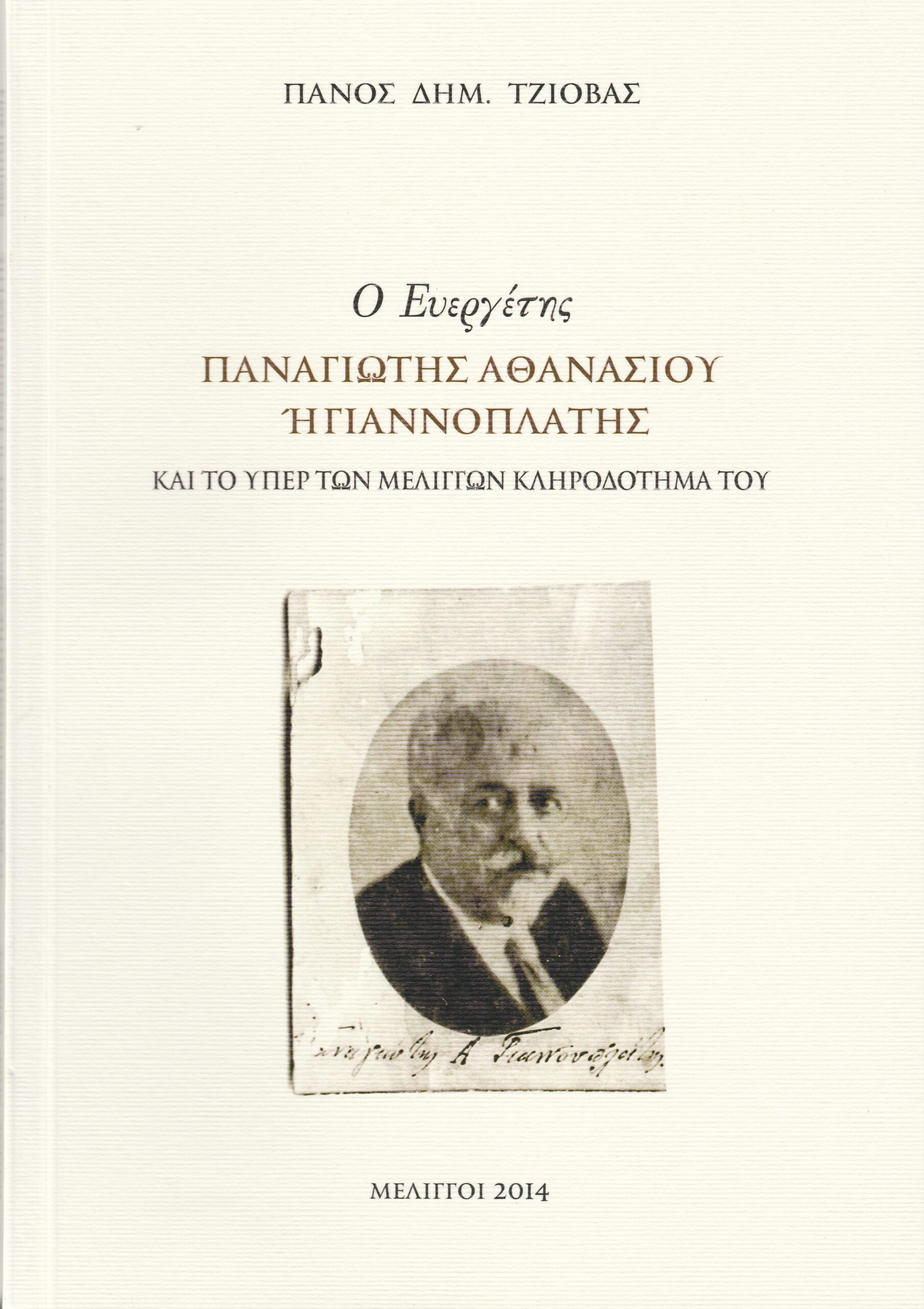 ΒιβλίαΠΑΝΟΥ Δ. ΤΖΙΟΒΑ “Ο Ευεργέτης Παναγιώτης Αθανασίου ή Γιαννοπλάτης και το υπέρ των Μελιγγών κληροδότημά του”Δημοσιεύτηκε 1 Ιουνίου, 2014 Έκδοση Αδελφότητας Απανταχού Ευρισκομένων Μελιγγιωτών, του 2014.